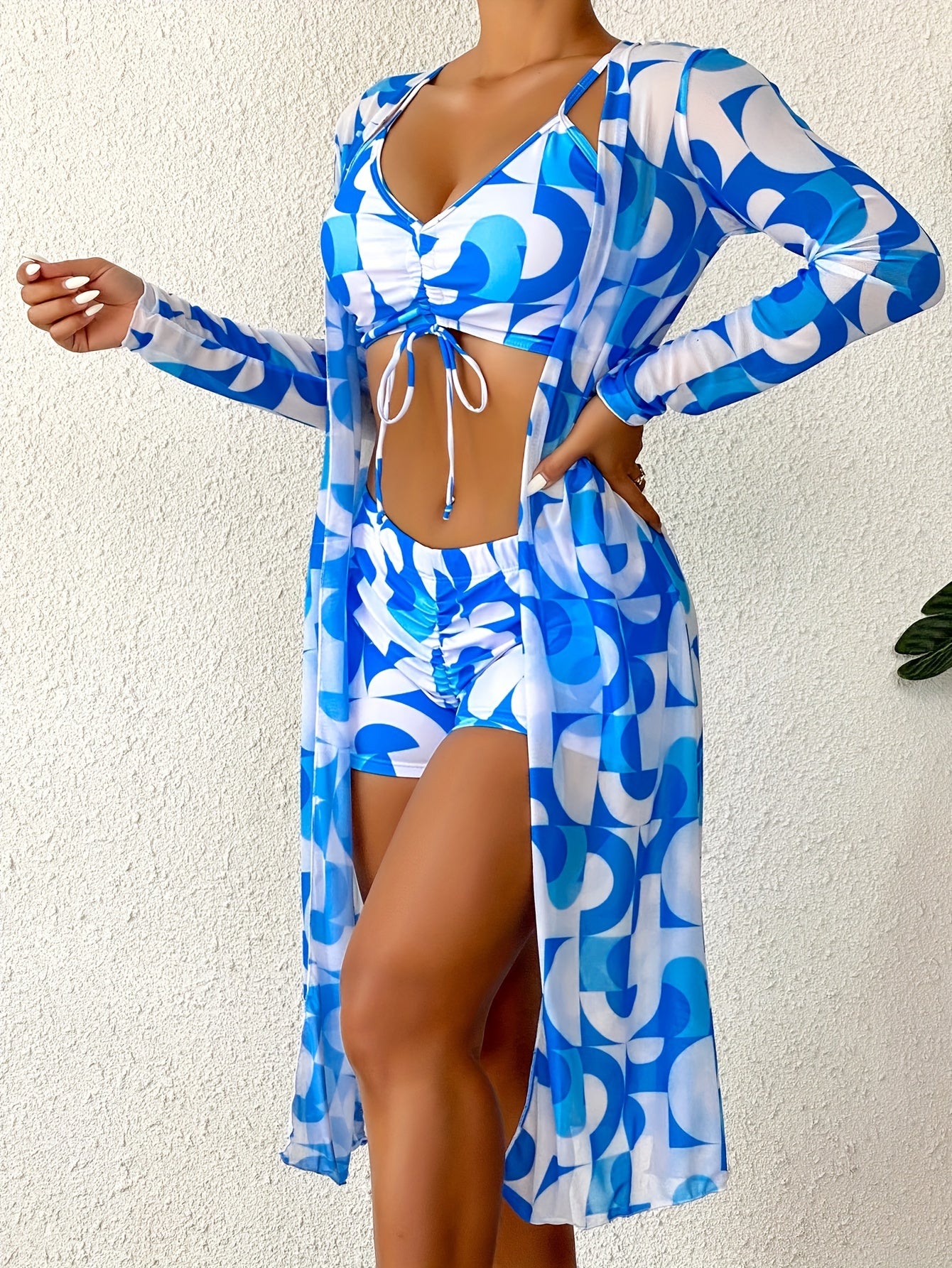 3 Piece Geometric Print Bikini Set - High Stretch, V Neck, Long Sleeves Cover Up Robe, Semi-Sheer, Spaghetti Strap, Customized Knit Fabric Swimsuits for Women